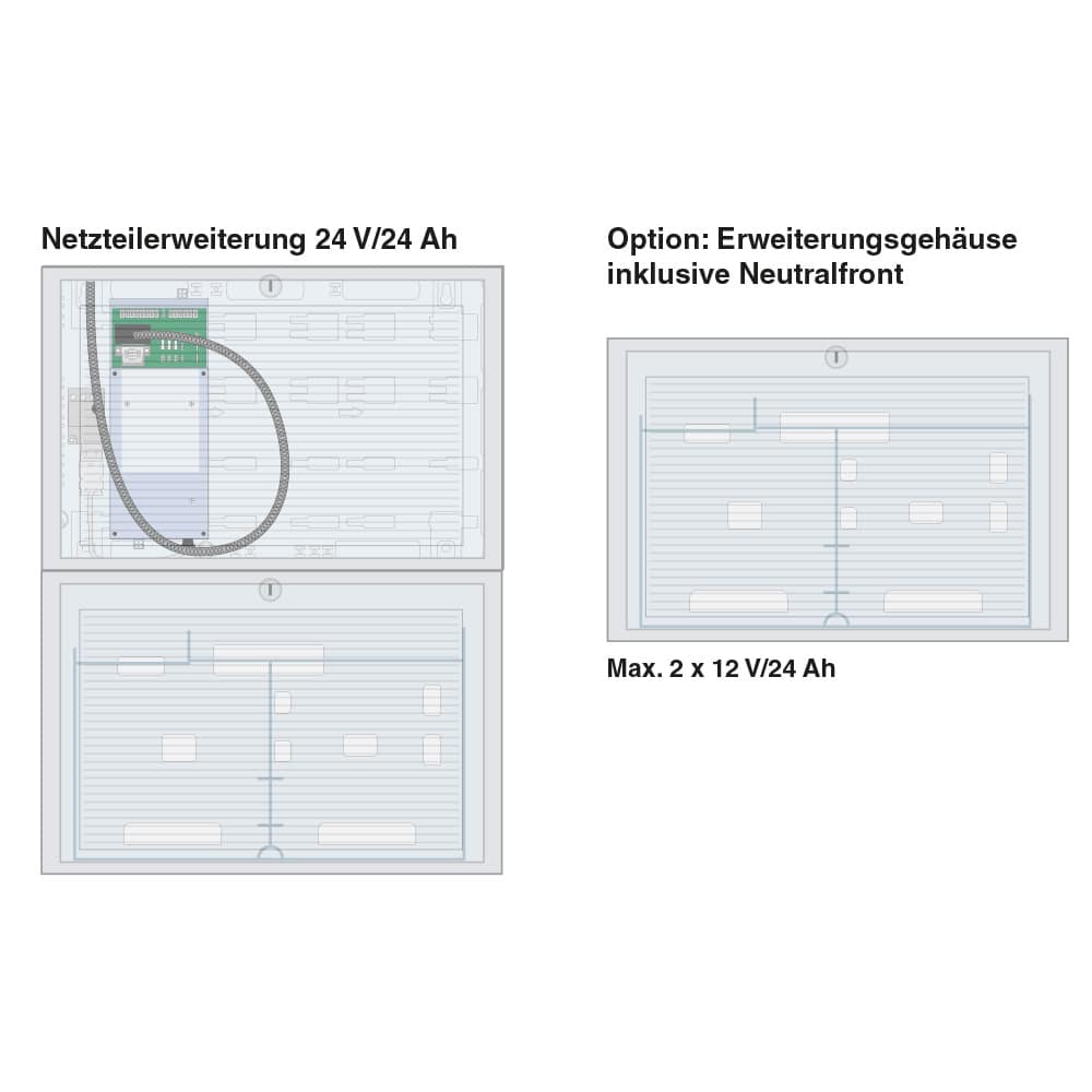 Die Netzteilerweiterung 24 V/24 Ah bietet eine optimale Möglichkeit, die systeminterne Energieversorgung um weitere 150 Watt zu erweitern. Sie ist ideal für Systeme, die zusätzliche Energie benötigen, und kann einfach über ein steckbares, vorkonfektioniertes Hybridkabel verbunden werden. Das Gehäuse bietet Platz für zwei Akkumulatoren mit 12 V/12 Ah. Bei Bedarf können über ein Zusatzgehäuse zwei weitere 12-Ah-Akkumulatoren angebunden werden, um die Kapazität zu erhöhen.